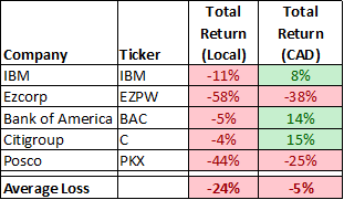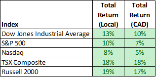 Fellow Canadians could have benefited from the fall in commodities by not owning Canadian Dollars. Canadians who invested in the US not only realized out sized gains this year, they also realized foreign currency gains that contributed an additional 7% to their returns.